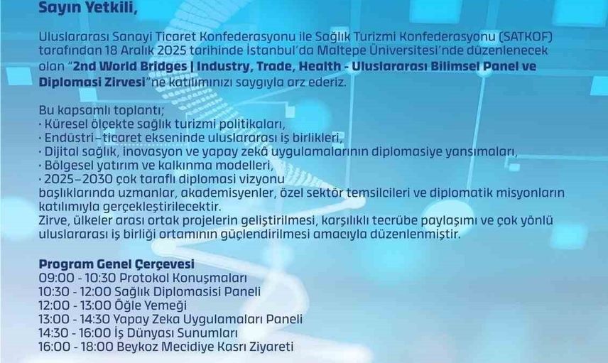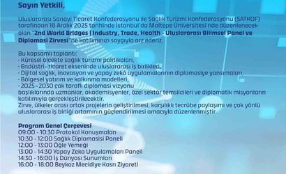 Organizatörler, 2nd World Bridges Zirvesi’nin ülkeler arası yeni ortaklıkların oluşmasına, akademi-sektör uyumunun güçlenmesine ve Türkiye’nin sağlık diplomasisi alanındaki küresel rolünün pekişmesine katkı sunmasını hedefliyor.