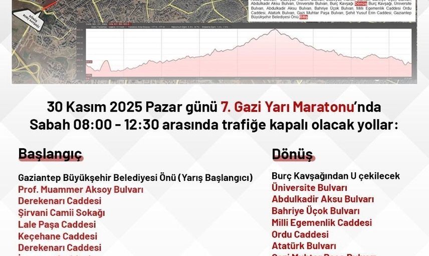 Gaziantep Büyükşehir Belediyesi tarafından düzenlenen 7’nci Gazi Yarı Maratonu kapsamında, 30 Kasım 2025 Pazar günü saat 08.00-12.30 arasında kent merkezinde bazı yollar trafiğe kapatılacak.