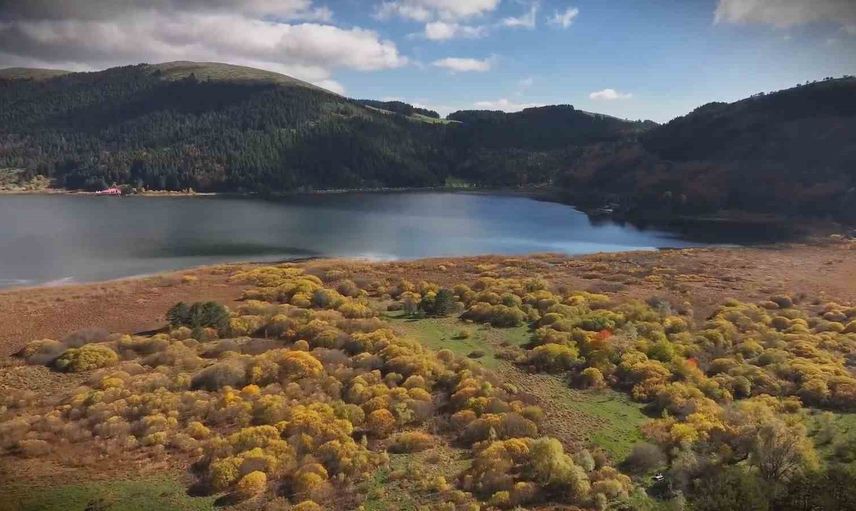 Dronla havadan görüntülenen alanlarda yaprakların renkleri göl çevresinde görsel bir şölen oluşturdu. Göl kenarında yürüyüş yapanlar bol bol fotoğraf çekti ve sonbaharın tadını çıkardı.