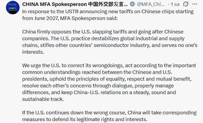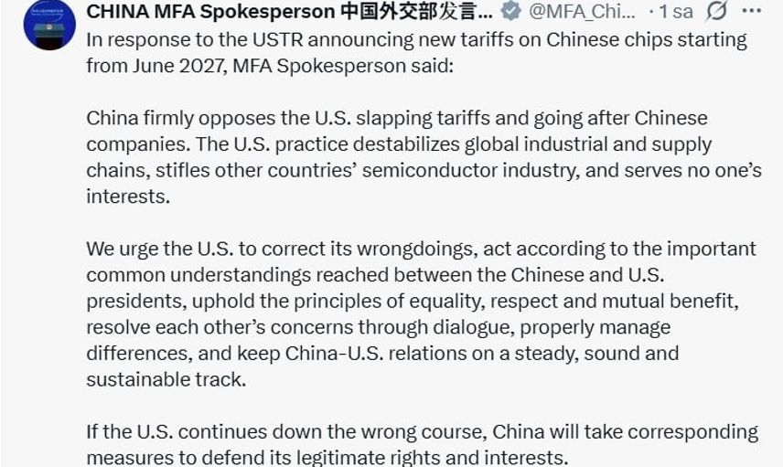 ABD TİCARET TEMSİLCİLİĞİ'NDEN (USTR) YAPILAN AÇIKLAMADA, ÇİN'DEN İTHAL EDİLECEK YARI İLETKENLERE 23 HAZİRAN 2027'DEN İTİBAREN GÜMRÜK VERGİSİ UYGULANACAĞI BİLDİRİRKEN ÇİN DIŞİŞLERİ BAKANLIĞI İSE ABD'Yİ BU KARARDAN DÖNMEYE ÇAĞIRARAK, "ABD YANLIŞ YOLDA İLERLEMEYE DEVAM EDERSE, ÇİN MEŞRU HAK VE ÇIKARLARINI SAVUNMAK İÇİN GEREKLİ ÖNLEMLERİ ALACAKTIR" AÇIKLAMASINDA BULUNDU.