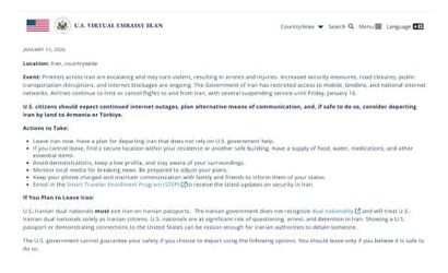 ABD Dışişleri Bakanlığı ve ABD’nin Tahran Sanal Büyükelçiliği, İran’da şiddete dönüşen gösterilerle ilgili olarak yeni bir güvenlik uyarısı yayımladı.