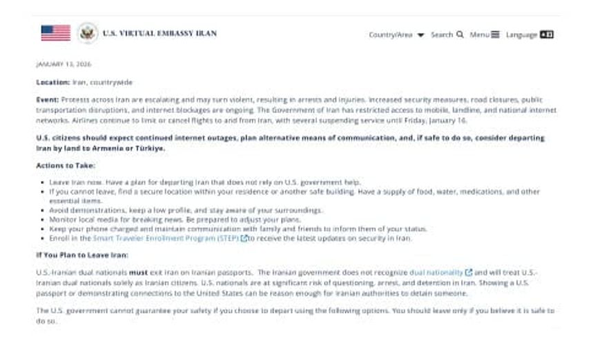 Vatandaşlara ayrıca, "İran’ı derhal terk edin. ABD hükümetinin yardımına ihtiyaç duymadan İran’dan ayrılma planınız olsun." çağrısı yapıldı. Güvenli değilse dışarı çıkmamak, evde veya başka güvenli bir binada güvenli bir yer bulmak, yanlarında yiyecek, su, ilaç ve diğer temel ihtiyaç maddelerini bulundurmak tavsiye edildi.