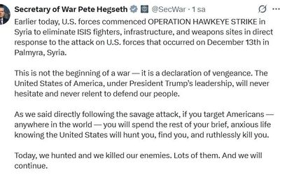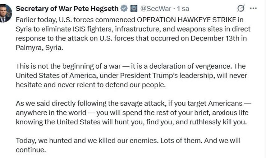 ABD Savunma Bakanı Pete Hegseth, X platformunda paylaştığı mesajda, ABD’nin erken saatlerde Suriye’de 'Hawkeye Strike Operasyonu'nu (Şahin Gözü Operasyonu) başlattığını duyurdu. Hegseth, bu operasyonun 13 Aralık’ta Tedmur (Palmira) bölgesinde ABD güçlerine yönelik saldırıya doğrudan yanıt olduğunu vurgulayarak operasyonun DEAŞ savaşçılarını, altyapısını ve silah mevzilerini ortadan kaldırmayı amaçladığını bildirdi.