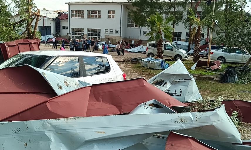 Adana'nın Kozan ilçesinde meydana gelen fırtına, bir okulun çatısını uçurarak park halindeki araçlara zarar verdi. O anlar, okulun güvenlik kamerası tarafından kaydedildi.