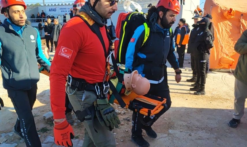 Ayrıca tatbikatta senaryoya göre uçurum kenarında askıda kalan bir otomobilde bulunan yaralının kurtarılması için halatlı tekniklerle operasyon gerçekleştirildi; ekipler uçurumdan aşağı sarkarak aracı ve içindekileri güvenli biçimde tahliye etti.