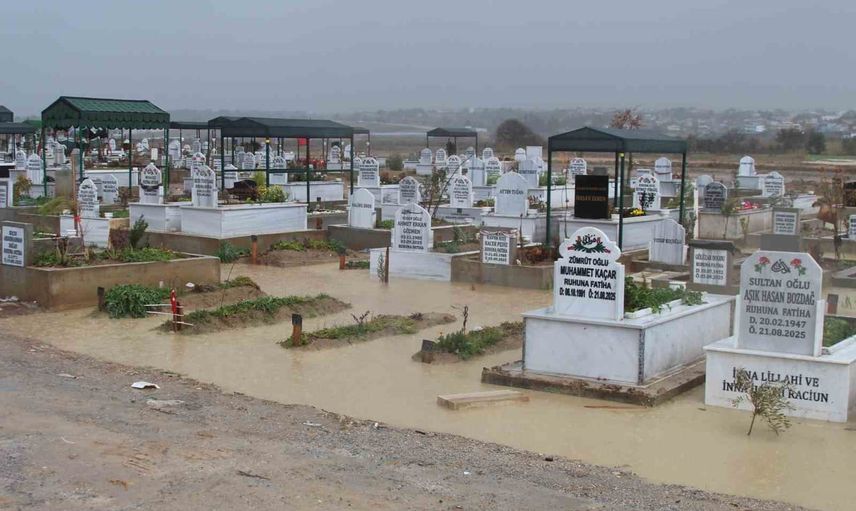 Kentte dün geceden beri devam eden sağanak yağış hayatı etkiliyor; taşan kanalın çevresindeki mezarlar suyla kaplandı. Bölgedeki görüntülerde kabirlerin su seviyesi nedeniyle zarar gördüğü görüldü.