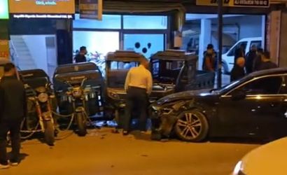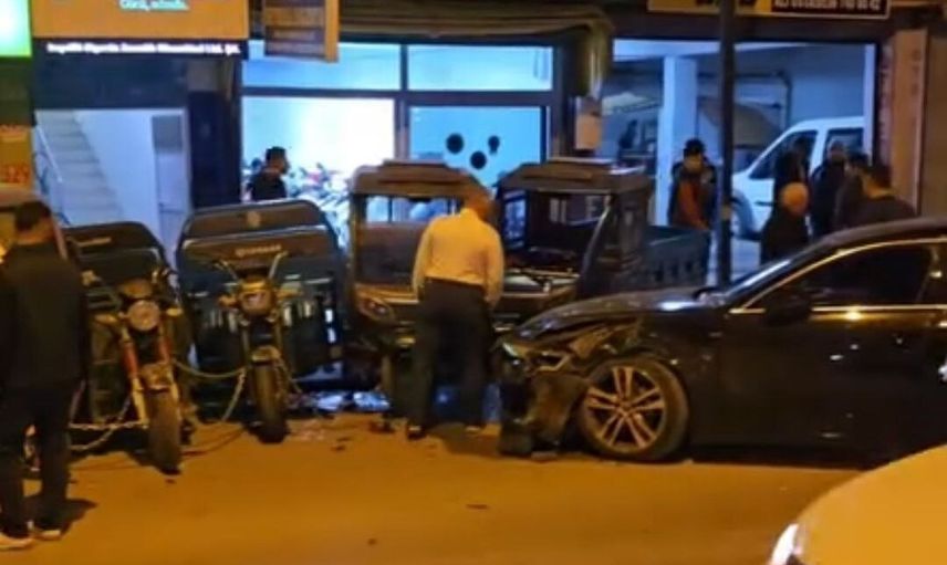 Gece saatlerinde meydana gelen olayda, sürücüsü ve plakası öğrenilemeyen bir otomobil, iddialara göre trafikte ağır ilerleyen araçları sollamaya çalışırken kontrolden çıkarak önce önündeki dolmuşa, ardından kaldırımda satış için sergilenen 3 tekerli 2 motosiklete çarptı.
