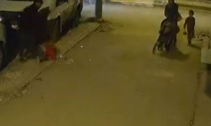 Güvenlik kamerasına yansıyan görüntülere göre, yanlarında üç çocuk olan bir kadın ve bir erkek ara sokağa giriyor. Çocuklardan biri erkek şahsın yanından uzaklaşınca, erkek şahsın çocuğun boğazını tutup önce kafasını arabanın arkasına vurduğu, ardından çocuğu yere fırlattığı görülüyor.