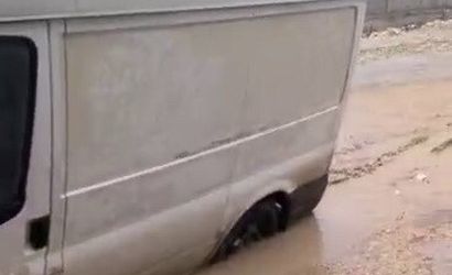 Adıyaman'da etkili olan yağışların ardından çöken yolda oluşan altyapı çukuru'na bir minibüs saplanarak hareketsiz kaldı.