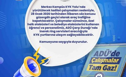 'Merkez Kampüs KYK Yolu’nda yürütülecek tadilat çalışmaları nedeniyle, 28 Ocak 2026 tarihinden itibaren söz konusu güzergah geçici olarak araç trafiğine kapatılacaktır. Çalışmalar süresince, özel halk otobüsleri ve belediye otobüslerini kullanan öğrenci ve personelimiz, ADÜ Çarşı Durağı’nda inerek ring servisleri aracılığıyla KYK yurtlarına ulaşım sağlayabilecektir'