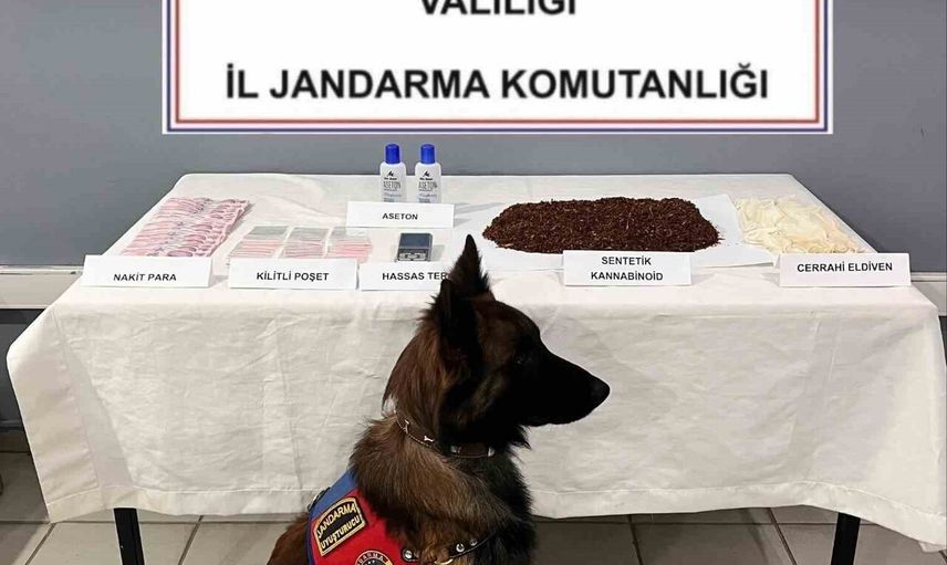 Afyonkarahisar İl Jandarma Komutanlığı ekiplerinin aldığı ihbar doğrultusunda Sinanpaşa ilçesindeki bir adrese düzenlenen baskında, plastik kova içinde aseton yedirilmiş ve uyuşturucu madde olduğu değerlendirilen yaklaşık 700 gram tütün, 200 adet kilitli poşet, hassas terazi, eldiven, 2 adet aseton şişesi ile suçtan elde edildiği değerlendirilen 5 bin 650 TL para ele geçirildi.