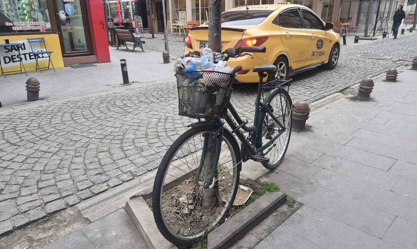 Aylardır bir ağaca kilitli duran bisikletin sepeti, duyarsız vatandaşların attığı atıklarla adeta bir çöp konteynerine dönüştü. Olay, kentin işlek noktalarından biri olan Odunpazarı İstiklal Mahallesi'nde görüldü.
