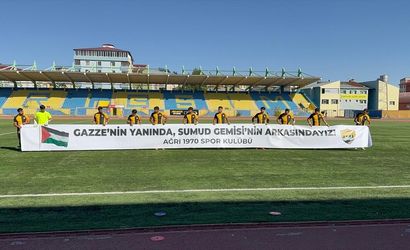 Ev sahibi Ağrı 1970 Spor futbolcuları, Vali Lütfü Yiğenoğlu Stadyumu'nda, İsrail'in Gazze'deki saldırılarına karşı farkındalık yaratmak ve Gazze Şeridi'ne insani yardım götüren Küresel Sumud Filosu'na destek vermek amacıyla bu pankartı açtılar. Bu anlamlı eylem, taraftarlar tarafından alkışlarla büyük bir coşkuyla karşılandı.