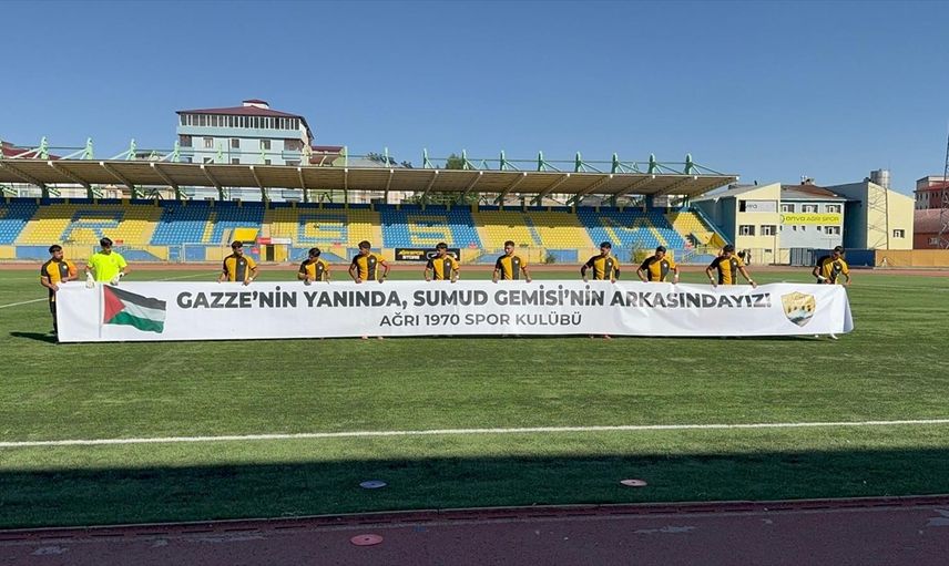 Nesine 3. Lig'de mücadele eden Ağrı 1970 Spor Kulübü futbolcuları, Eti Gübre Mazıdağı Fosfatspor ile oynadıkları karşılaşma öncesinde dikkat çekici bir eylem gerçekleştirerek, "Gazze'nin Yanında Sumud Gemisi'nin Arkasındayız" yazılı pankartla sahaya çıktılar.