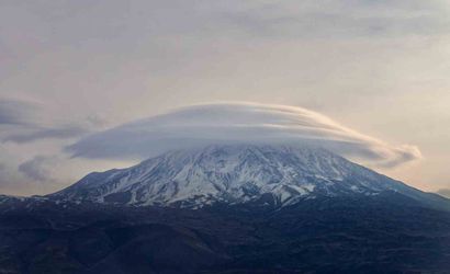 Ağrı Dağı'nda nadir rastlanan bir atmosferik oluşum, bölgedeki doğa severlerin dikkatini çekti. Fotoğraf sanatçısı Mehmet Kılıçoğlu tarafından fotoğraflanan 'mercek bulutu' (lenticular cloud), dağın zirvesini sararak etkileyici bir manzara yarattı.