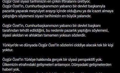 Çelik açıklamasında, Özel’in yaklaşımını iftira kampanyası olarak nitelendirip, Cumhurbaşkanımızın bölgesel ve küresel konularda izlediği yolun tüm dünya tarafından takip edildiğini ve Özel’in bu dinamikleri doğru izleyip öğrenmesi gerektiğini belirtti.