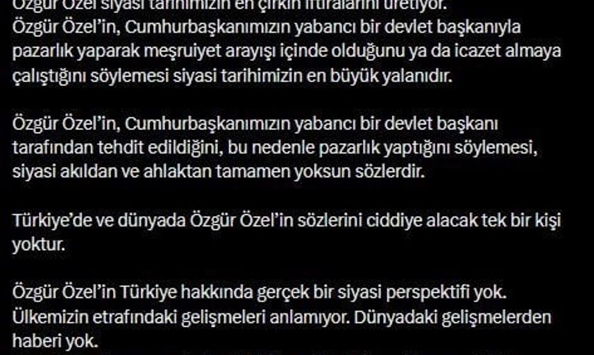 AK Parti Sözcüsü, “Türkiye’de ve dünyada Özgür Özel’in sözlerini ciddiye alacak tek bir kişi yoktur” diyerek Özel’in ülke ve bölge meselelerine dair gerçek bir siyasi perspektiften yoksun olduğunu, bölgesel ve küresel gelişmeleri yeterince takip etmediğini savundu.