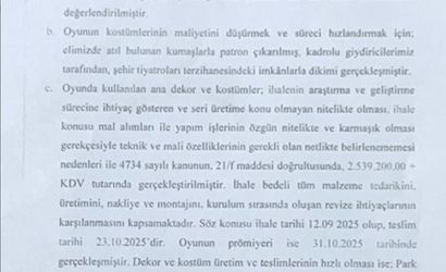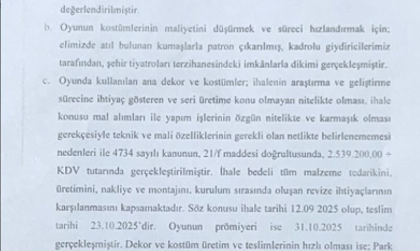Yazılı önerge üzerine verilen yanıtı referans gösteren Yıldız, oyuna ilişkin harcamaların resmi olarak şu şekilde bildirildiğini aktardı: dekor için 3 milyon lira, yönetmenlik ücreti için 600 bin lira, ışık tasarımı için 350 bin lira ve diğer giderlerle birlikte toplamda 4 milyon lirayı aşan bir harcama yapıldığı belirtildi.