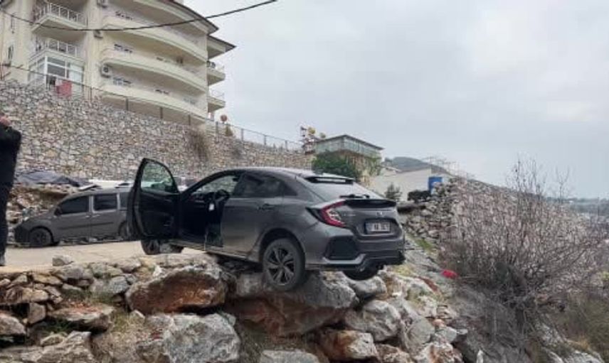 Alanya'da geri manevra yapan Honda SUV şarampolde asılı kaldı
