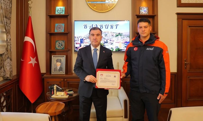 Bayburt’un Gökçedere Beldesinde seyir halindeyken kontrolden çıkarak takla atan ve alev alan araçta sıkışan 5 kişiyi, İl Afet ve Acil Durum Müdürlüğü Arama Kurtarma Teknisyeni Abdurrahman Avcı kurtardı. Başarılı müdahalesi nedeniyle Avcı’ya, Vali Mustafa Eldivan tarafından başarı belgesi takdim edildi.