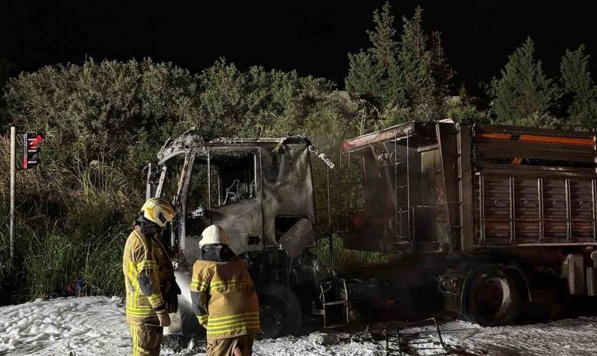 İzmir'in Aliağa ilçesinde, gece saatlerinde seyir halinde olan bir tırın çekici bölümünden aniden dumanlar yükseldi ve kısa sürede alevler büyüdü. Tır sürücüsü Yusuf Çetinkaya, aracını yol kenarına çekerek hızla dışarı çıktı ve canını kurtardı.