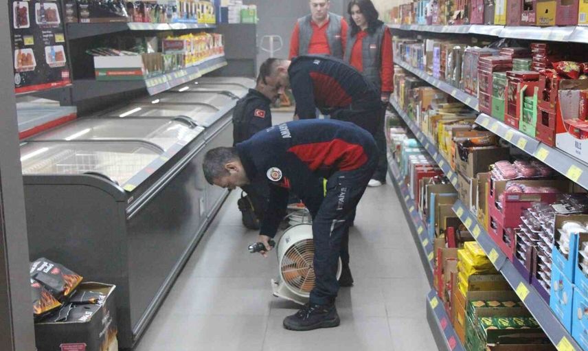 Market durumu: Yangın algılama dedektörlerinin alarm verdiği markette duman nedeniyle göz gözü görmedi; çalışanlar ve müşteriler endişeyle dışarı çıktı. İtfaiye ekipleri alevleri söndürüp dumanı tahliye etti.