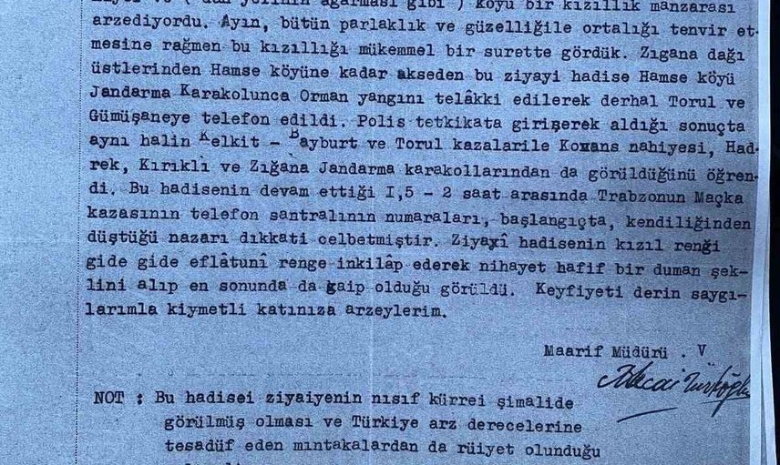 1940 yılına ait belgelerde ise olayın birçok il ve ilçede gözlendiği, Kandilli’nin Milli Eğitim müdürlüklerine yazı yolladığı ve Şebinkarahisar Kaymakamlığı ile Gümüşhane, Tokat ve Elazığ Milli Eğitim Müdürlüklerine ait resmi yazışmaların bulunduğu yer alıyor. Özellikle Gümüşhane İl Milli Eğitim Müdürü’nün; güney kutbunda da aynı olayın görülüp görülmediğini sorgulayan notu dikkat çekiyor.