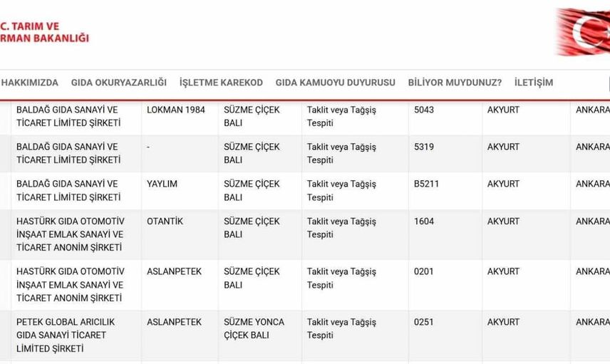 Hastürk Gıda Otomotiv İnşaat Emlak Sanayi ve Ticaret Anonim Şirketi adına listede yer alan 'Otantik Süzme Çiçek Balı' ve 'Aslanpetek Süzme Çiçek Balı' ürünlerinin de taklit veya tağşiş kapsamına girdiği belirtildi.