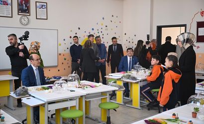 Ankara'nın Yenimahalle ilçesindeki Şehit Ali Öztürk Ortaokulu'nda, "Aile Yılı" kapsamında, cam fanuslar içinde bitkilerin yetiştirildiği küçük ekosistemler oluşturmayı amaçlayan "Sevgi Teraryumu Atölyesi" etkinliği düzenlendi. Etkinliğe Yenimahalle Kaymakamı Tahsin Kurtbeyoğlu (solda) katıldı.