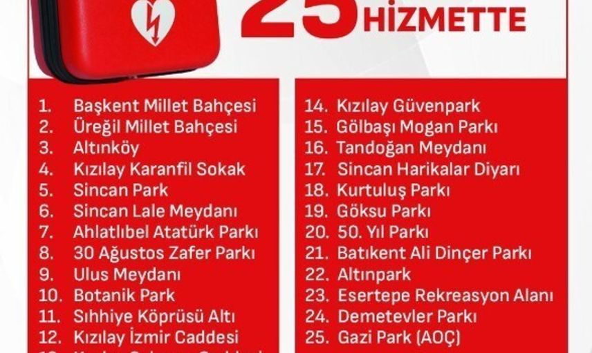 ANKARA VALİLİĞİ, ANİ GELİŞEN KALP DURMALARI VAKALARINA KARŞI OTOMATİK EKSTERNAL DEFİBRİLATÖR (OED) ŞOK CİHAZLARININ BELİRLENEN 25 NOKTAYA YERLEŞTİRİLDİĞİNİ AÇIKLADI.