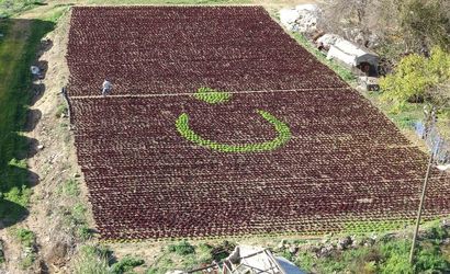 Muratpaşa ilçesi Zümrütova Mahallesi’nde iki üretici, bir buçuk dönümlük arazide kırmızı ve açık yeşil marulları özel bir düzenle dikip Türk bayrağı formu oluşturdu. Kırmızı yapraklı marulların arasına yerleştirilen açık yeşil kıvırcık marulların verdiği hilal ve yıldız görünümü, bölgeden geçenlerin dikkatini topluyor.