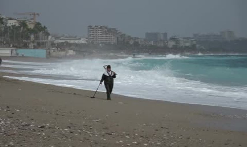Antalya'da fırtına sırasında dedektörle sahil araması