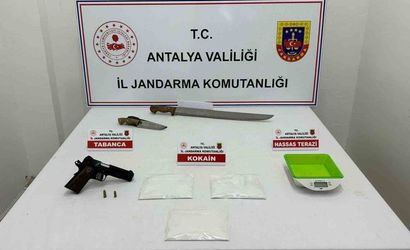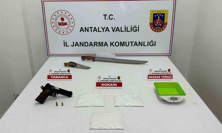 Arama sonucunda ele geçirilenler arasında 1 kilo 350 gram kokain, 100 gram kubar esrar, 50 kullanımlık A4 kağıdı, 1 kök kenevir bitkisi, 250 gram kenevir tohumu, 2 ruhsatsız av tüfeği, 1 tabanca, 2 pala ve 1 hassas terazi bulundu.