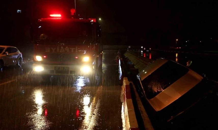 Antalya'nın Kepez ilçesi Habipler Mahallesi Elmalılı Hamdi Yazır Caddesi üzerinde, saat 00.30 sıralarında meydana gelen kazada, yağış nedeniyle kayganlaşan yolda kontrolden çıkan bir otomobil refüje çarpıp yağmur suyu tahliye kanalına düştü.