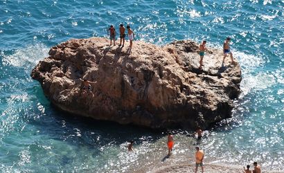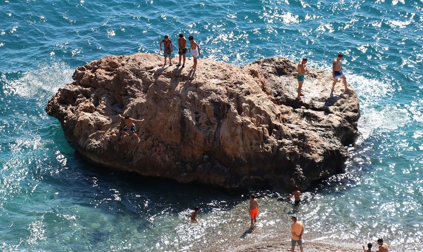 Plajda, denize girenler, kumsalda güneşlenenler ve palmiye ağaçlarının altında yürüyüş yapanlar gözlemlendi. Çocuklar, Varyant bölgesinden kayalıklara atlayarak Akdeniz'de eğlendi.
