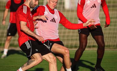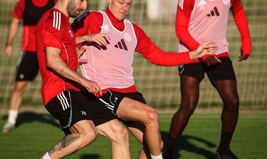 Hesap.com Antalyaspor, Trendyol Süper Lig'in 9. haftasında deplasmanda Gaziantep FK ile yapacağı maçın hazırlıklarına devam etti. Atilla Vehbi Konuk Tesisleri'ndeki idmana katılan Doğukan Sinik (solda) ile Nikola Storm (ortada) bir pozisyonda mücadele etti.