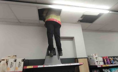 HATAY'DA MARKETİN HAVALANDIRMA BOŞLUĞUNDA MAHSUR KALAN KEDİ İTFAİYE EKİPLERİNCE KURTARILDI.