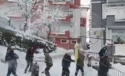 Temizlik için görevlendirilen Artvin Belediyesine ait iş makinesine karşılık veren minikler, kartopu atarak adeta sahayı savundu. Görüntülerde çocukların kahkahalar eşliğinde kartopu attığı, operatörün ise tebessüm ederek durumu cep telefonuyla kaydettiği görülüyor.