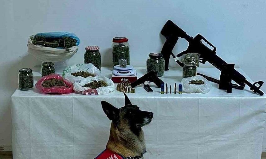 Yapılan aramalar sonucunda, 2 kilo 970 gram kubar esrar, 442 gram skunk, 1 adet hassas terazi, 1 adet tabanca, 1 tabanca şarjörü, 27 adet 9 mm tabanca fişeği, 1 ruhsatsız av tüfeği, 2 av tüfeği şarjörü, 2 av tüfeği kartuşu, 2 adet 7.62 mm fişek, 1 adet 5.56 mm manevra fişeği ve 3 adet cep telefonu ele geçirildi.