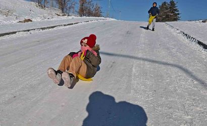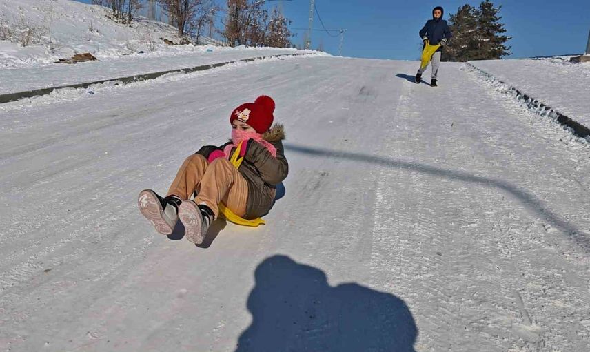 Soğuk hava günlük yaşamı olumsuz etkilerken, çocuklar dondurucu havaya aldırış etmedi. İlçenin farklı noktalarında karla kaplı yokuşlarda kayan çocuklar, soğuk havaya rağmen doyasıya eğlenerek renkli görüntüler oluşturdu; neşeleri zorlu kış şartlarına rağmen yüzleri gülümsetti.