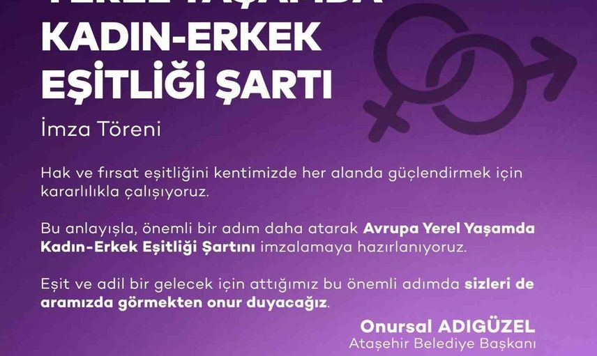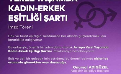 Ataşehir Belediyesi, kadınların kent yaşamından eşit, özgür ve güvenli biçimde yararlanmasını sağlamak amacıyla Avrupa Yerel Yaşamda Kadın-Erkek Eşitliği Şartını imzalamaya hazırlanıyor. İmza töreni 24 Kasım Pazartesi günü saat 11.00'de Ataşehir Belediyesi Başkanlık Fuaye Alanı'nda gerçekleştirilecek.