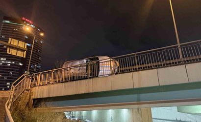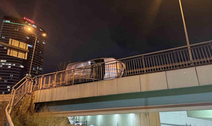 AVCILAR, E-5 YAN YOL SEYİR HALİNDE BULUNAN OTOMOBİL BAŞKA BİR ARACA ÇARPARAK BARİYERLE KÖPRÜ KORKULUKLARI ARASINA DÜŞTÜ, KAZADA 2 KİŞİ YARALANDI.