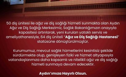 Aydın Ağız ve Diş Sağlığı Merkezi, Sağlık Bakanlığı onayıyla fiziki ve hizmet altyapısının genişletilmesi sonucunda artık Aydın Ağız ve Diş Sağlığı Hastanesi olarak hizmet verecek.