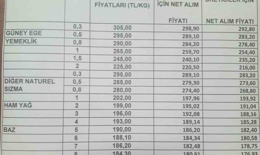 Diğer naturel sızma yağlar için açıklanan fiyatlar: 0,3 asit 295 TL, 0,5 asit 285 TL, 0,8 asit 280 TL, 1 asit ham yağ 202 TL.