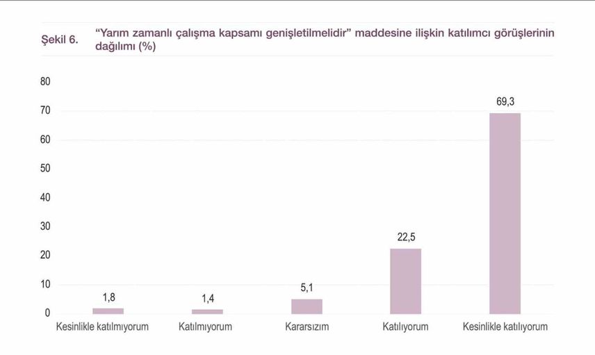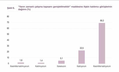 Araştırmada kadın kamu görevlilerinin özlük haklarındaki kayıplardan rahatsız oldukları, yarı zamanlı çalışmanın yeniden düzenlenmesini istedikleri ve tam istihdamla birlikte güvenceli esnek çalışma modellerinin geliştirilmesini bekledikleri ortaya çıktı. Aydın, özellikle haftalık dört günlük çalışma modelinin gündeme alınması gerektiğini ve kadın kamu görevlilerinin haftalık çalışma süresinin 32 saate düşürülmesi önerisini yineledi.