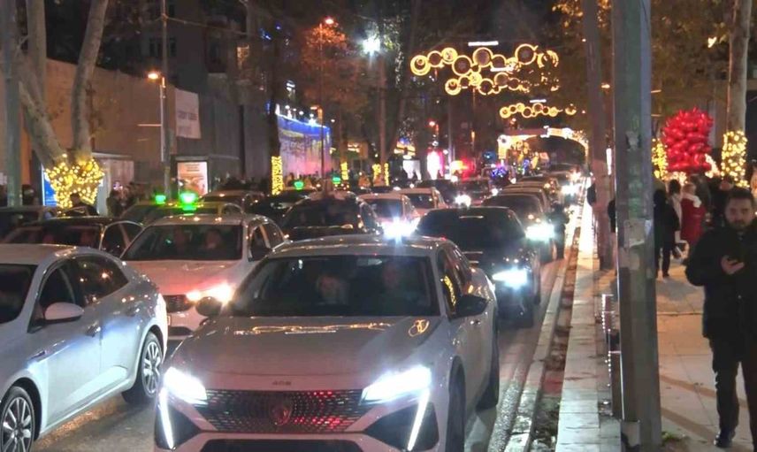 Geri sayım öncesinde caddeyi dolduran araçlar, oluşturdukları konvoylarla ve kornalarla yeni yıla sesli bir geçiş yaptı. 2026'ya saniyeler kala oluşan konvoy, renkli görüntüler sundu; bazı vatandaşlar canlı müzik eşliğinde eğlenirken, bir bölümü bu anları cep telefonlarıyla kaydetti.