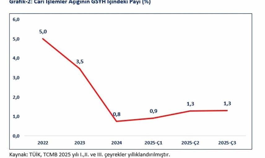 Cari işlemler dengesine ilişkin olarak Bolat, cari işlemler açığının GSYH içindeki payının tarihsel ortalamaların altında seyrini sürdürdüğünü belirterek, yıllıklandırılmış olarak üçüncü çeyrek itibarıyla bu oranın %1,3 olduğunu söyledi. (Bakanın verdiği geçmiş veriler: 2022 %5,0; 2023 %3,5; 2024 %0,8).