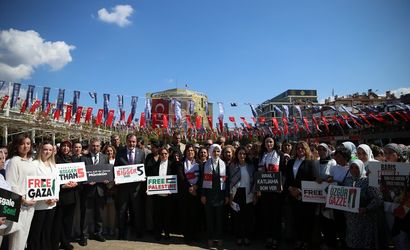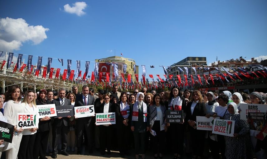 Aile ve Sosyal Hizmetler Bakanı Mahinur Özdemir Göktaş (ortada), Aydın'da "Gazze İçin Sessiz Çığlık" eylemine katıldı. Eylem kapsamında, AK Parti Aydın İl Kadın Kolları Başkanı Şahika Edremit de açıklamalarda bulundu.