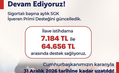 Işıkhan sosyal medya hesabından yaptığı paylaşımda, "İşverenlerin belirli şartlara uygun istihdam ettikleri her sigortalı çalışan için aylık SGK İşveren Primi Desteği’ni güncelledik. İlave istihdama 7 bin 184 lira ile 64 bin 656 lira arasında destek sağlıyoruz. Cumhurbaşkanımızın imzasıyla Resmi Gazete’de yayımlanan kararla uygulamamızı 31 Aralık 2026 tarihine kadar uzattık." ifadelerini kullandı.