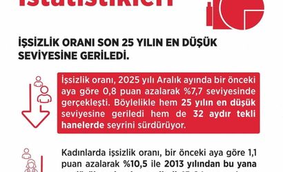 Bakan Işıkhan, işsizlik oranının Aralık 2025'te bir önceki aya göre 0,8 puan azalarak yüzde 7,7 seviyesinde gerçekleştiğini bildirdi. Bu düşüşle birlikte işsizlik oranı 25 yılın en düşük seviyesine geriledi ve 32 aydır tek haneli seyretmeye devam etti. İşsiz sayısı ise 286 bin kişi azalarak 2 milyon 736 bin kişi oldu.